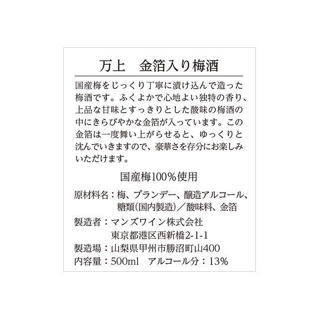 国産梅を使用してじっくりと仕上げた濃厚で味わい深い梅酒です。その中にきらびやかな金箔が入っています。一度舞い上がらせるとゆっくり沈んでいきますので、グラスに注ぐと金箔が優雅に舞い上がり、華やかさを演出します。お祝い事、お土産、贈り物にもおすすめです。