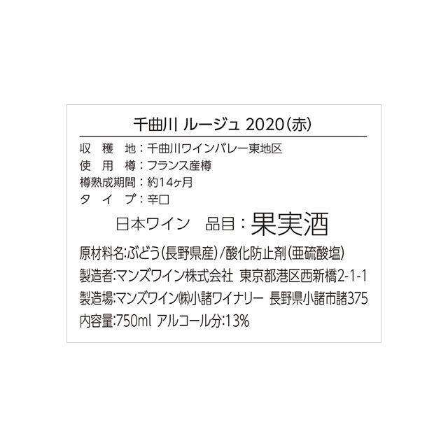 ぶどう産地 長野県 ヴィンテージ 2020 内容量 750ml アルコール分 13% タイプ 赤 味わい 辛口 渋味 軽い 飲み頃温度 10-12℃