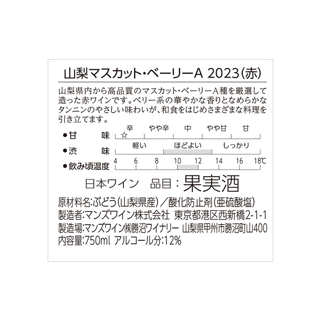 品種 マスカット・ベーリーA ぶどう産地 山梨県 ヴィンテージ 2023 内容量 750ml アルコール分 12% タイプ 赤 味わい 辛口 渋味 ほどよい 飲み頃温度 10-12℃