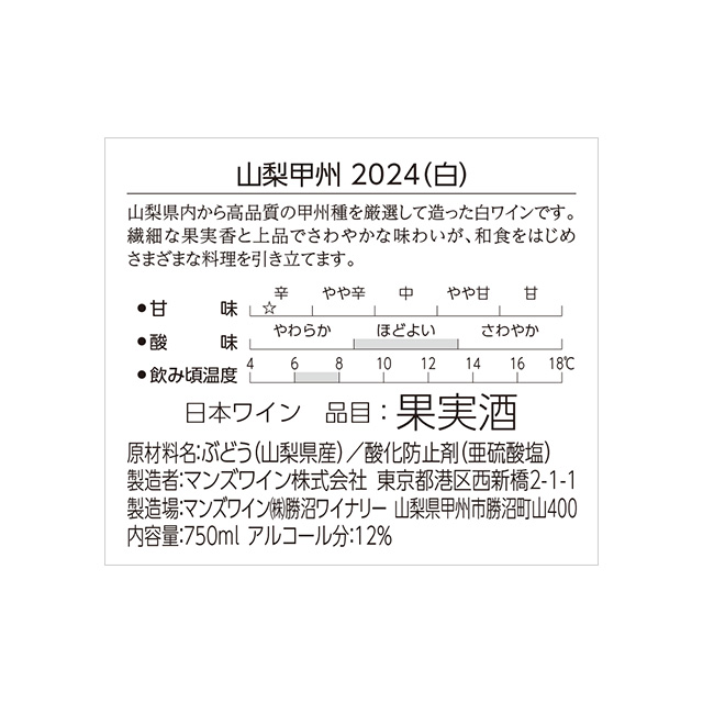 品種 甲州 ぶどう産地 山梨県 ヴィンテージ 2024 内容量 750ml アルコール分 12% タイプ 白 味わい 辛口 酸味 ほどよい 飲み頃温度 6-8℃