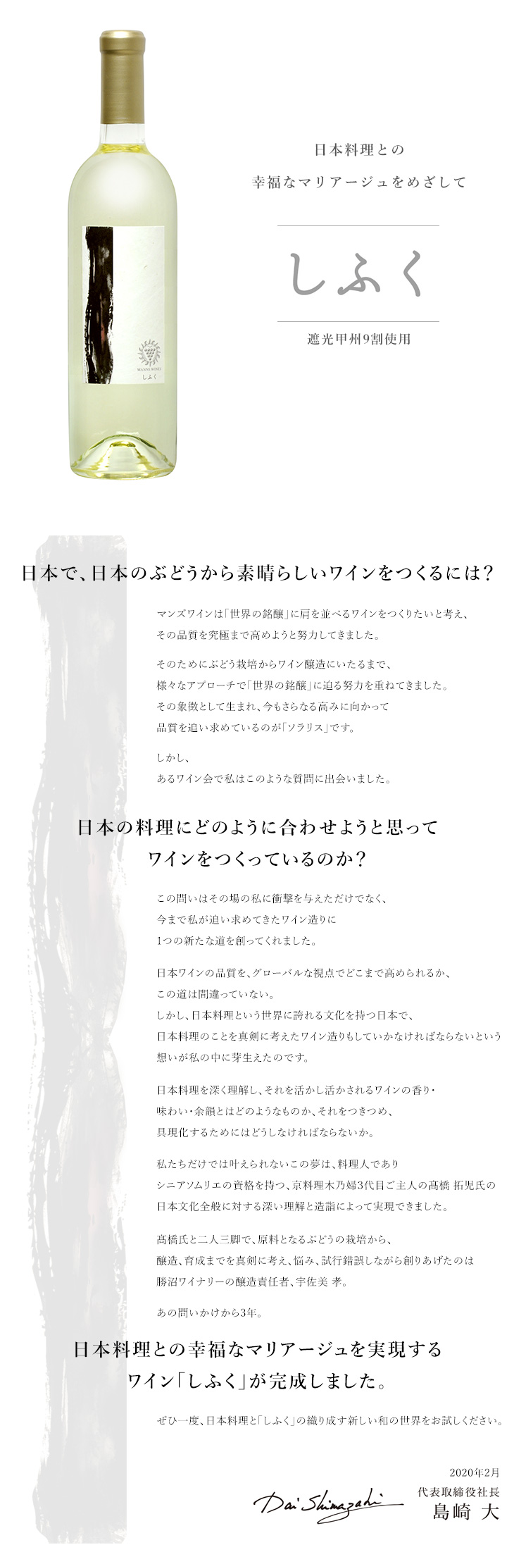 開発には3年かかってしまいましたが、四季折々の日本料理に合うワインだと確信しております。是非、日本料理とのマリアージュをお楽しみください。