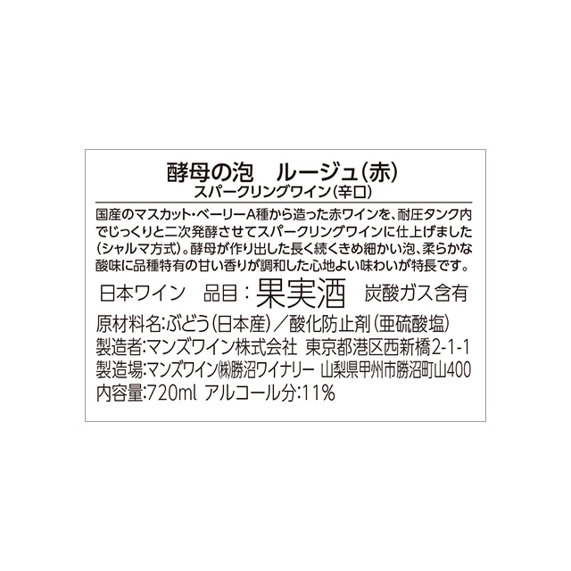品種 マスカット・ベーリーA ぶどう産地 日本 内容量 720ml アルコール分 11% タイプ 赤/スパークリング 味わい 辛口 渋味 軽い 飲み頃温度 6-8℃