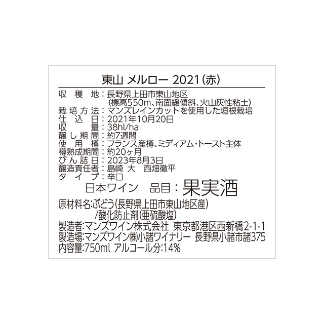 品種 メルロー ぶどう産地 長野県上田市東山地区 ヴィンテージ 2021 内容量 750ml アルコール分 14% タイプ 赤 味わい 辛口 渋味 しっかり 飲み頃温度 16-18℃ 醸造責任者 西畑 徹平