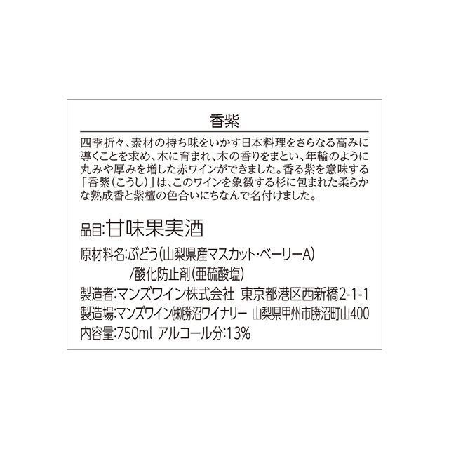 四季折々、素材の持ち味をいかす日本料理をさらなる高みに導くことを求め、木に育まれ、木の香りをまとい、年輪のように丸みや厚みを増した赤ワインができました。香る紫を意味する「香紫(こうし)」は、このワインを象徴する杉に包まれた柔らかな熟成香と紫檀の色合いにちなんで名付けました。