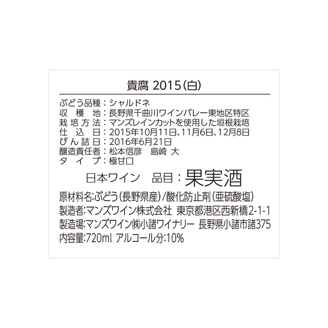 品種 シャルドネ ぶどう産地 長野県千曲川ワインバレー東地区特区 ヴィンテージ 2015 内容量 750ml アルコール分 10% タイプ 白 味わい 極甘口 酸味 ほどよい 飲み頃温度 6-8℃ 醸造責任者 島崎 大
