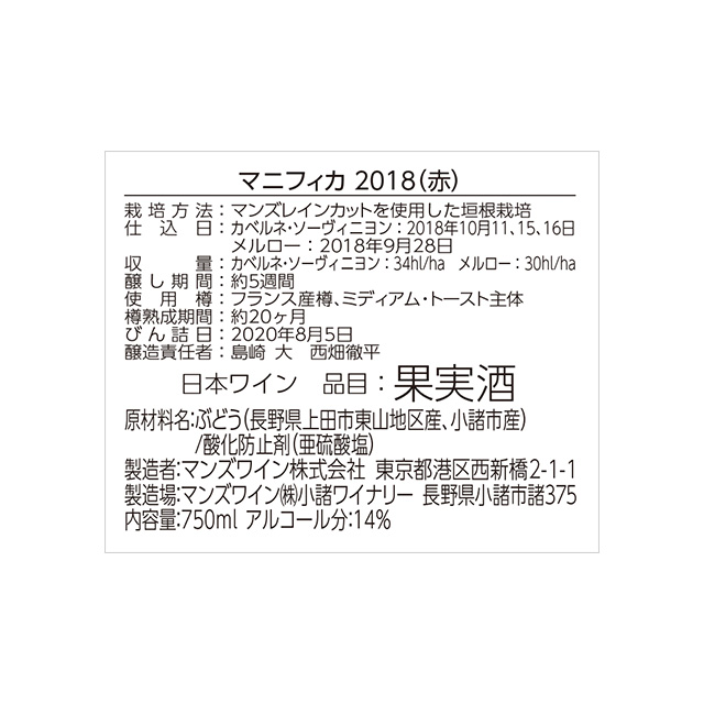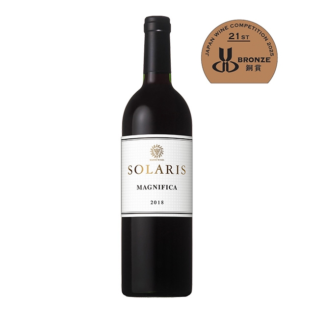 ソラリスの「東山 カベルネ・ソーヴィニヨン」や「東山 メルロー」等のトップキュヴェが傑出した出来となった収穫年のキュヴェを最上の比率でブレンドし、ワイナリーのセラーで長期熟成を経てからリリースされます。2018年は上田市東山地区のトップレンジ「東山 カベルネ・ソーヴィニヨン」と「東山 メルロー」用のキュヴェから樽選抜しアッサンブラージュしています。厳しい収量制限を行い、手作業による徹底的な選果・除梗により完熟した健全な果粒のみを厳選し、ステンレスタンクで発酵、樽で約20ヶ月育成しました。しっかりとした骨格と凝縮感のあるボディ、熟成による複雑で上品な香りを持ったワインです。2001年のソラリス発売から、これまでリリースしたヴィンテージは、2002、2006、2009、2012、2014、2015、2017の7ヴィンテージのみです。8ヴィンテージ目となるマニフィカの堂々たる味わいをお楽しみください。