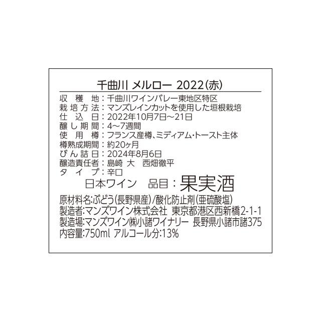 長野県千曲川ワインバレー東地区の自社管理及び契約栽培畑のメルローを使用しています。マンズワインはこの地区でいち早く欧州系ぶどうの栽培を開始し、樹齢は30年以上のものも含まれています。手作業で丁寧に収穫・選果・除梗を行い、ステンレスタンクで発酵、樽で約20ヶ月間育成しました。なめらかでバランスの良い味わいが特長です。