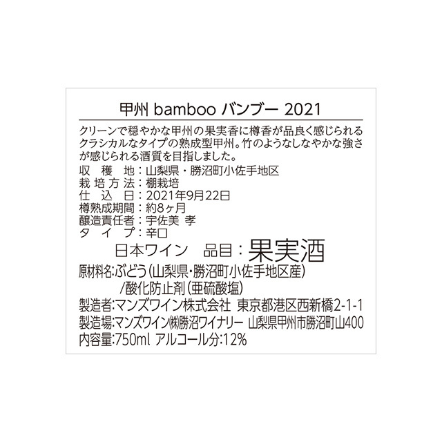 「バンブー」の名前は、竹の花言葉の「節度」「忠誠」「強さ」といった意味から、決して流行に流されず、果実味や樽などそれぞれの要素が出過ぎることなくバランスを保つ、竹のようなしなやかな強さが感じられるワインをイメージしてつけました。