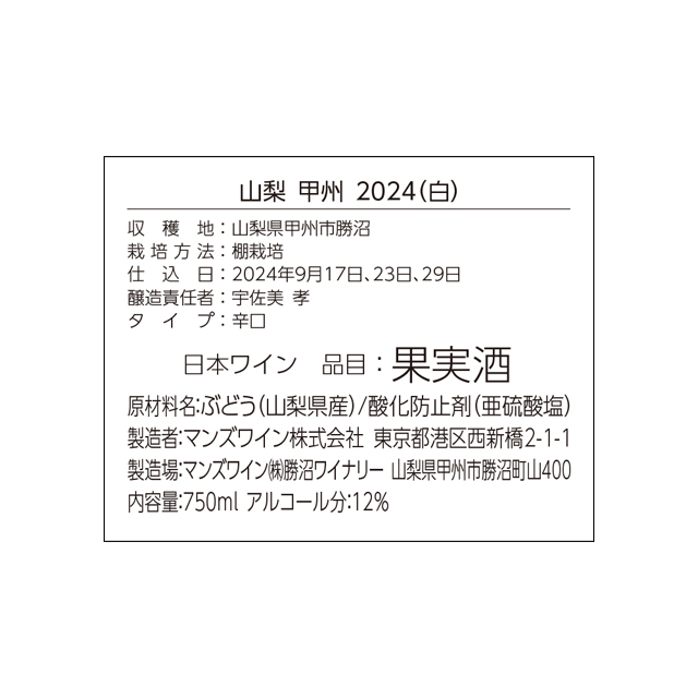 品種 甲州 ぶどう産地 山梨県甲府盆地 ヴィンテージ 2024 内容量 750ml アルコール分 12% タイプ 白 味わい 辛口 酸味 ほどよい 飲み頃温度 8-10℃ 醸造責任者 宇佐美 孝