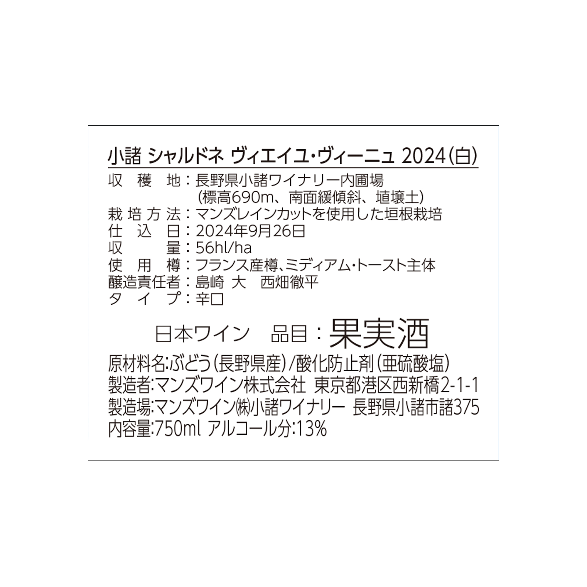 品種 シャルドネ ぶどう産地 長野県小諸ワイナリー内圃場 ヴィンテージ 2024 内容量 750ml アルコール分 13% タイプ 白 味わい 辛口 酸味 ほどよい 飲み頃温度 10-12℃ 醸造責任者 西畑 徹平