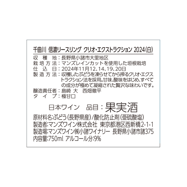 品種 信濃リースリング ぶどう産地 長野県小諸市大里地区 ヴィンテージ 2024 内容量 750ml アルコール分 9% タイプ 白 味わい 極甘口 酸味 ほどよい 飲み頃温度 8-10℃ 醸造責任者 西畑 徹平