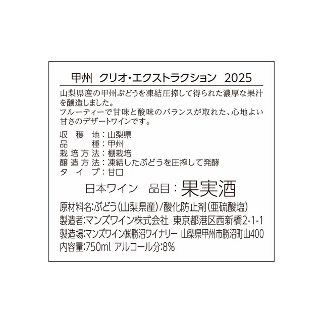 品種 甲州 ぶどう産地 山梨県 ヴィンテージ 2025 内容量 750ml アルコール分 8% タイプ 白 味わい 甘口 酸味 さわやか 飲み頃温度 8-10℃