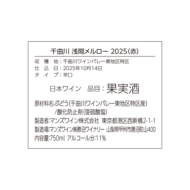 品種 浅間メルロー ぶどう産地 千曲川ワインバレー東地区特区 ヴィンテージ 2025 内容量 750ml アルコール分 11% タイプ 赤 味わい 辛口 渋味 ほどよい 飲み頃温度 10-12℃