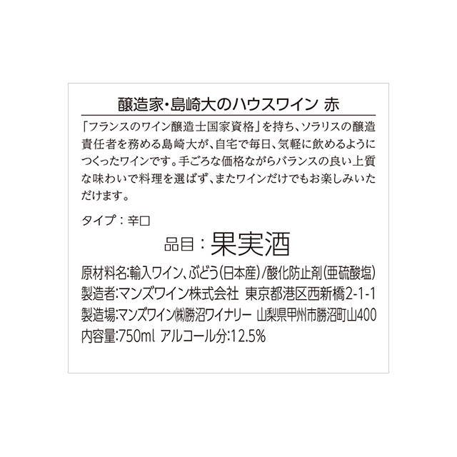 「フランスのワイン醸造士国家資格」を持ち、ソラリスの醸造責任者を務めた、マンズワイン社長の島崎大が、自宅で毎日、気軽に飲みたいと思えるワインをアッサンブラージュ(複数種のワインをブレンド)して造りました。